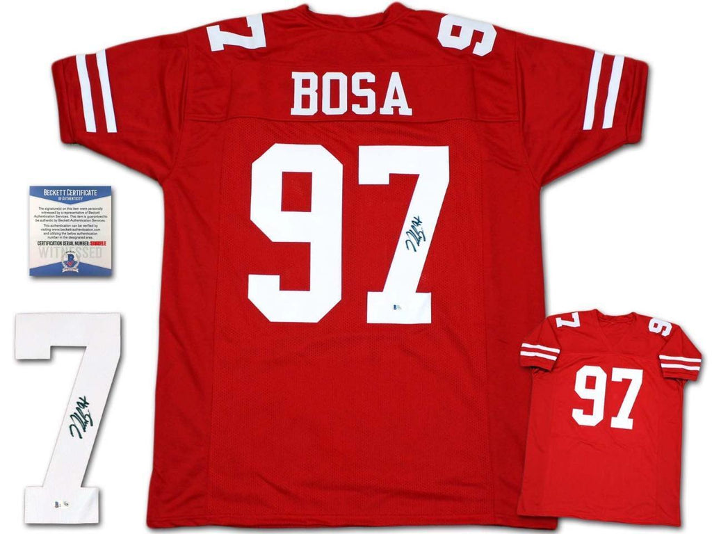 This signed item is brand new without tags or logos. The jersey is custom sewn in a size 52 (XL). All the letters and numbers are sewn on! This autographed jersey will make a great gift or a great addition to any collection! ATHLETE: Nick Bosa ITEM: Custom Sewn Jersey AUTHENTICATION: The item comes with a Beckett Authentication Services (BAS) certificate of authenticity and serial #'ed sticker affixed to the item. To ensure authenticity, the serial # can be reviewed online. This process helps to ensure that the product purchased is authentic and eliminates any possibility of duplication or fraud. NOTE: All of our autographed jerseys are custom jerseys, unless otherwise noted. Our custom jerseys are NON-BRANDED, have NO logos, NO tags, NO patches, NO emblems. All letters and numbers are SEWN-ON. The non-branded jerseys are made specifically for the player(s) to sign, for collectible purposes.