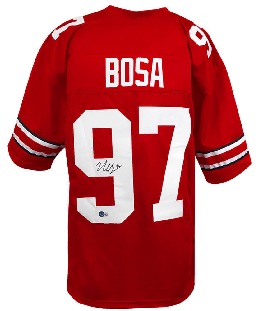 Nick Bosa signed red custom college football jersey. Item comes with a Beckett Authentication tamper evident numbered sticker and Certificate of Authenticity which can be verified online. Jersey is size XL.