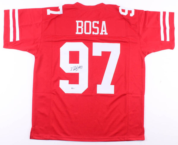 Custom on-field style jersey. Everything is sewn on, size XL. Has been hand-signed in black felt-tip pen by Nick Bosa. The lot / autograph(s) includes an official Beckett Authentication Services serially numbered hologram and matching COA for authenticity purposes.Authentication: Beckett COA