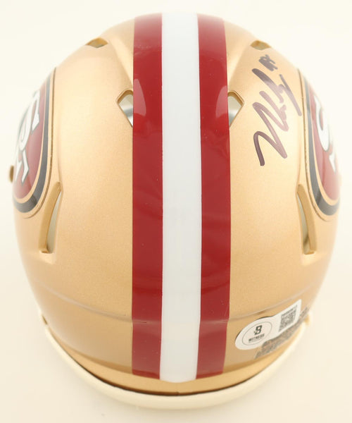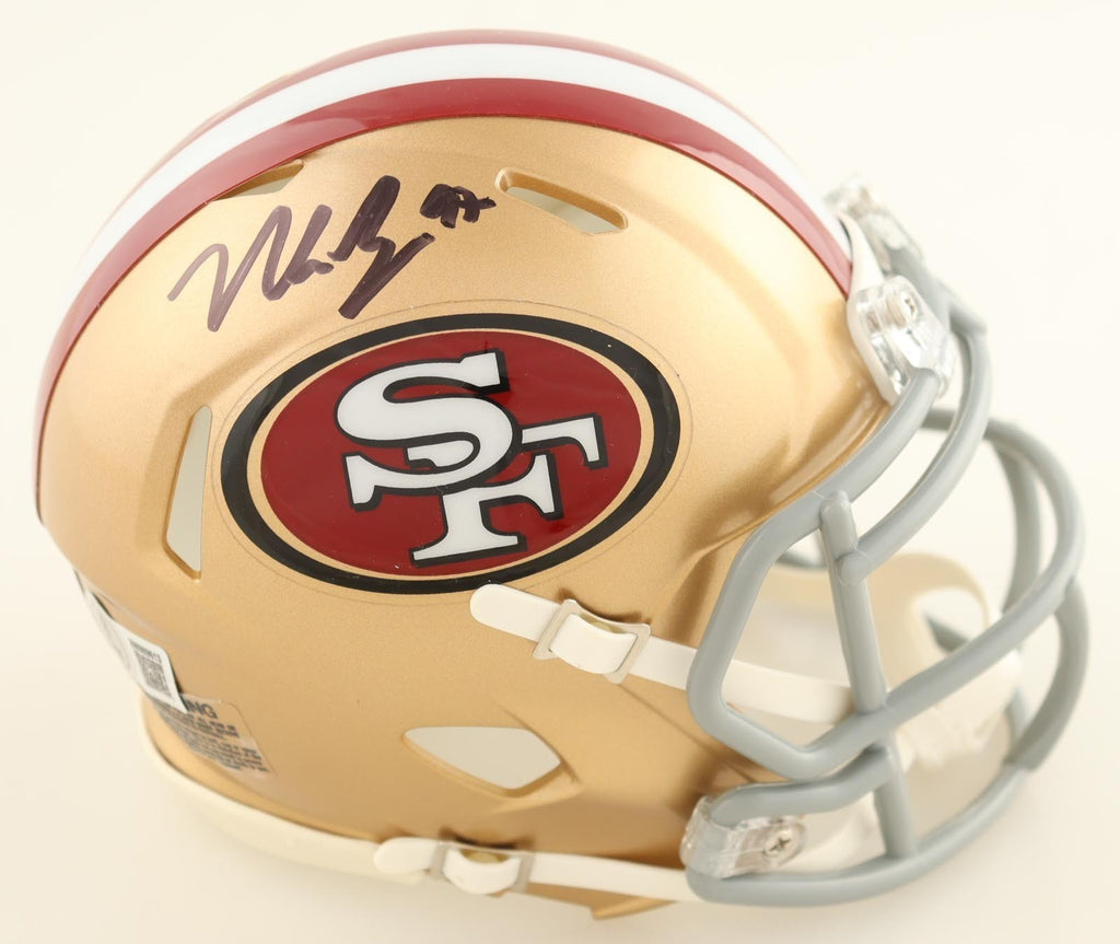 Riddell San Francisco 49ers speed mini helmet. Hand-signed by Nick Bosa.The autograph includes an official Beckett Authentication Services serially numbered scannable hologram and QR Code card for authenticity purposes. The signing of this item was witnessed by Beckett.Authentication: Beckett Scannable Hologram with QR Code card