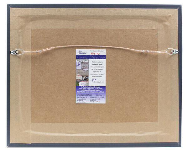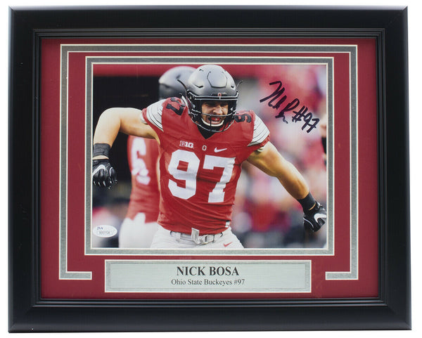 Featured is a Nick Bosa signed and framed 8x10 Ohio State State Buckeyes photo. This photo was hand signed by Nick Bosa and has been authenticated by JSA authentication services. Included with the photo is a JSA hologram and certificate of authentication Brand new professional framing featuring double matting and engraved nameplate. The frame measures approximately 14x11 in total size, and it is ready for display. This item would make a great addition to any sports memorabilia collection. SPECIFICATIONS Autographed By: Nick Bosa Team: Ohio State State Buckeyes Sport: Football Authentication: Professional Sports Authenticator (PSA)