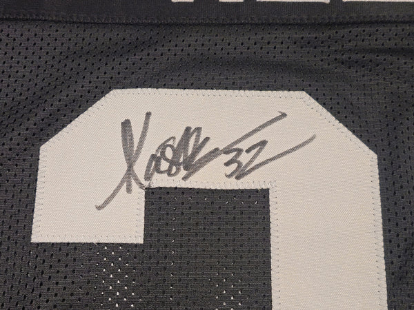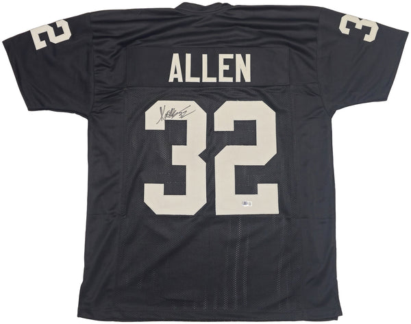This is a Black Jersey that has been hand signed by Marcus Allen. This is a custom jersey with no name brand. The approximate size is XL. It has nice sewn in name and numbers. This item has been witnessed and certified authentic by Beckett Authentication (BAS) and comes with their tamper-proof witness sticker.