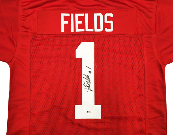 This is a Red Jersey that has been hand signed by Justin Fields. This is a custom jersey with no name brand. The approximate size is XL. It has nice sewn in name and numbers. This item has been witnessed and certified authentic by Beckett Authentication (BAS) and comes with their tamper-proof witness sticker.