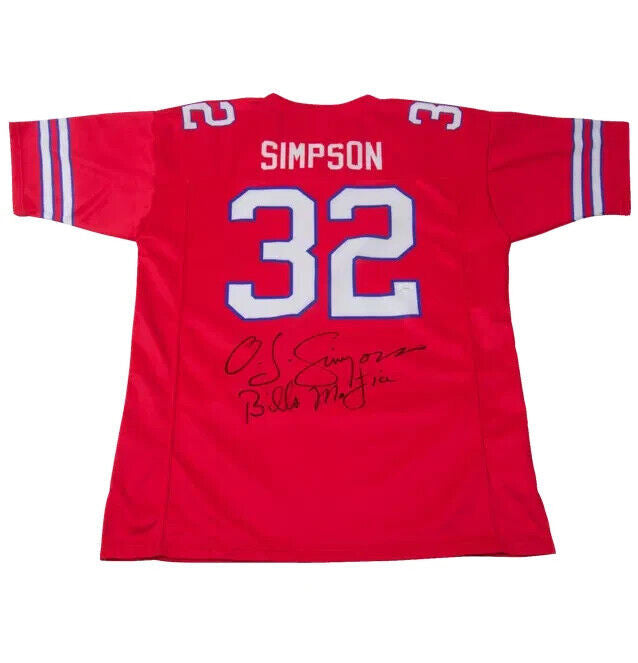 This is a OJ Simpson Signed Buffalo Bills Football Jersey Inscribed Bills Mafia with JSA. THE ITEM IN THE PICTURE IS A STOCK IMAGE. YOU WILL RECEIVE AN IDENTICAL ITEM OF EQUAL QUALITY. ALL JERSEYS ARE SIZE LARGE. Every item of signed memorabilia we sell is official and of the highest quality. We pride ourselves on providing sports fans with the most exclusive signed memorabilia on the market. We are an industry leading signed memorabilia company who can guarantee 100% authenticity on every signature we sell. The item you receive will be identical to the one you are seeing in the stock pictures. This includes the item, the authentication company, signature color and signature placement. We take pride in ensuring the authenticity of all our items. With unwavering commitment, we guarantee that every signature is 100% authentic. Every item of signed memorabilia comes with a scannable barcode which takes you to the certificate of authenticity on the company's website. These industry leading authentication companies include Beckett Authentication Services, James Spencer Authentication Services and Professional Sports Authentication Services.