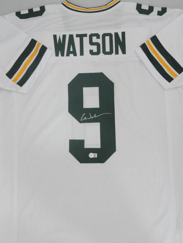 Custom Replica jersey hand signed by Green Bay Packers Receiver CHRISTIAN WATSON. The signature is in Silver Paint pen. This jersey was signed at a private signing with us and would make a great addition to any Packers collection! The jersey size is XL and all letters and numbers are sewn in. This autograph is guaranteed to be 100% authentic and will include a COA serial numbered hologram from Beckett Authentication.