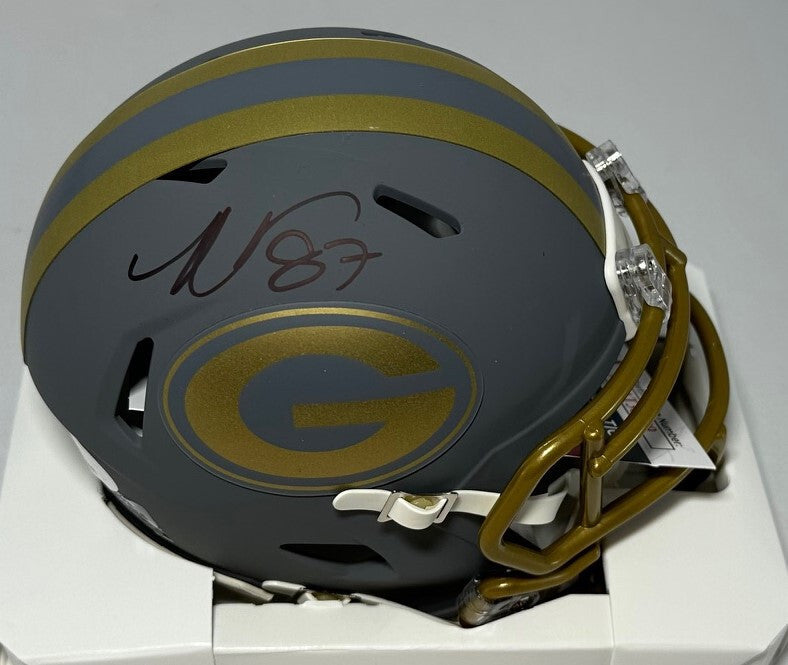 Green Bay Packers SLATE speed Mini Helmet hand signed by Green Bay Packers Wide Receiver ROMEO DOUBS. The signature is in black paint pen. This would make a great addition to any Packers collection. This item was signed at a private signing with us. This item is guaranteed to be 100% authentic and will include a COA from JSA authentication.