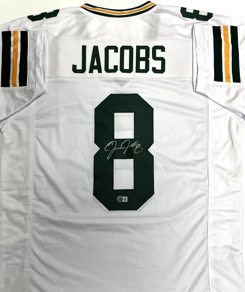 Custom Replica jersey hand signed by Green Bay Packers Running Back JOSH JACOBS. The signature is in Silver Paint Pen. This jersey was signed at a private signing with us and would make a great addition to any Packers collection! The jersey size is XL and all letters and numbers are sewn in. This autograph is guaranteed to be 100% authentic and will include a COA hologram from Beckett authentication.
