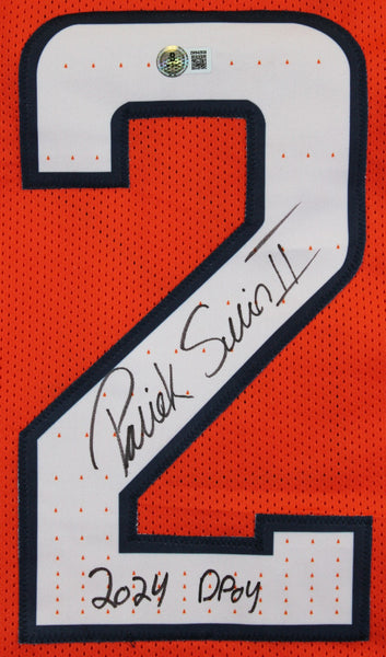 This Autographed Orange Pro Style Jersey with the inscription of "2024 DPOY" has been Personally Signed by Patrick Surtain II of the Denver Broncos. This item is 100% Authentic to include a hologram by Beckett Authentication Services. This item will come with an affixed Beckett Authentication Services (BAS) authentication sticker, which includes a scannable QR code to verify authenticity. Please note that Beckett no longer provides serial-numbered COA cards, and the attached BAS sticker will serve as the complete authentication for this item. This is a BAS Witnessed Protection Program item which means a Beckett Authentication Service representative was present when this item was being signed. We conducted an autograph signing with Patrick Surtain II where multiples of the same item were signed. While the photographs are representative of this item, the size, placement and strength of the signature may vary. Each item is hand signed, therefore, each autograph is unique. This item can be verified through BAS Witnessed. This is a X-Large sized, non-branded, custom-stitched Jersey.