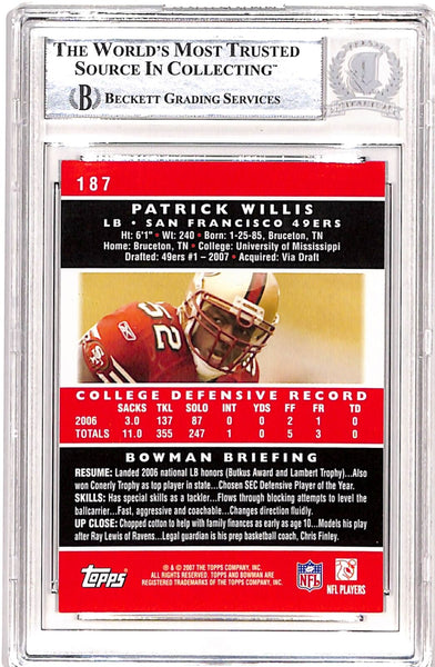 Patrick Willis Autographed/Signed 2007 Bowman #187 Card Beckett 38718 The number in the listing title is just an inventory sku for our records and is not the authentication number. The item pictured is the exact item you will receive so see photos for condition. This is a slabbed 2007 Bowman #187 Trading Card that was personally autographed by Patrick Willis. Includes a certificate of authenticity from Beckett Authentication Services (BAS) and Denver Autographs.