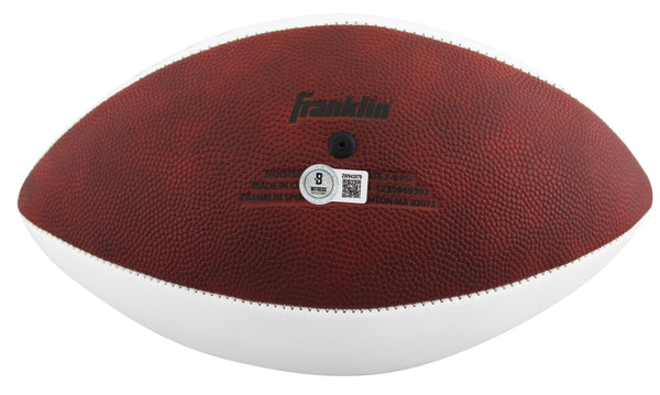 This Autographed Franklin White Panel Football W/ Uv Mirrored Back Acrylic Display Case has been Personally Signed by Christian Gonzalez of the New England Patriots. This item is 100% Authentic to include a hologram by Beckett Authentication Services. This item will come with an affixed Beckett Authentication Services (BAS) authentication sticker, which includes a scannable QR code to verify authenticity. Please note that Beckett no longer provides serial-numbered COA cards, and the attached BAS sticker will serve as the complete authentication for this item. This is a BAS Witnessed Protection Program item which means a Beckett Authentication Service representative was present when this item was being signed. We conducted an autograph signing with Christian Gonzalez where multiples of the same item were signed. While the photographs are representative of this item, the size, placement and strength of the signature may vary. Each item is hand signed, therefore, each autograph is unique. This item can be verified through BAS Witnessed.