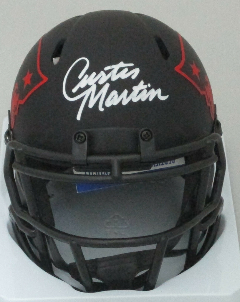 Riddell ECLIPSE Mini Helmet hand signed by New England Patriots Hall of Famer CURTIS MARTIN. The signature is in White paint pen. This item was signed at a private signing and would make a great addition to any Patriots collection! This item is guaranteed to be 100% authentic and will include a COA from PSA/DNA authentication.