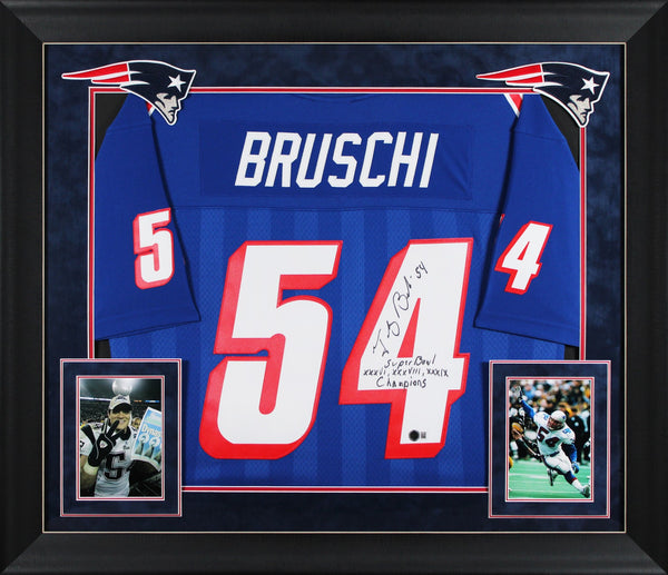 Patriots Tedy Bruschi "SB Champions" Signed Navy M&N TB Framed Jersey BAS Wit