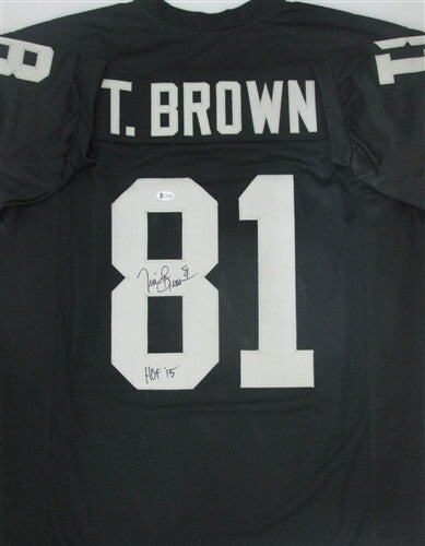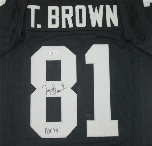 Custom Replica jersey hand signed by Oakland Raiders Hall of Famer TIM BROWN. The signature is in Black Sharpie. This jersey was signed at a private signing with us and would make a great addition to any RAIDERS collection! The jersey size is XL and all letters and numbers are sewn in. This item is guaranteed to be 100% authentic and will include a COA hologram from Beckett authentication.