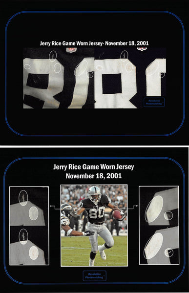 This Autographed November 18, 2001 Game Used Black Reebok Jersey with the inscription of "Raiders Vs S.D. Chargers T.D. 191, 192, 193" has been Personally Signed by Jerry Rice of the Oakland Raiders. This item is 100% Authentic to includes a numbered hologram by Fanatics. The authenticity can be verified on Fanatics website. This jersey has also been photo matched by Sports Investors Authentic, and comes with a LOA for the game use and photmatching.