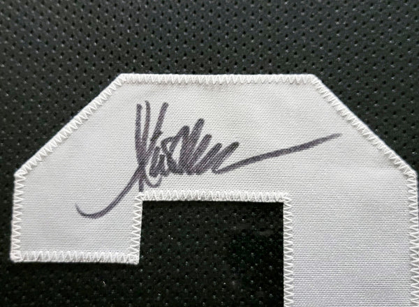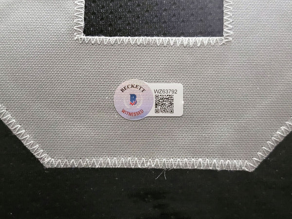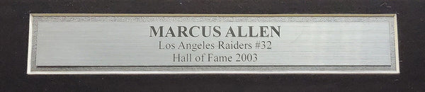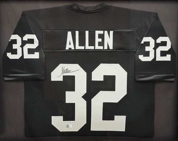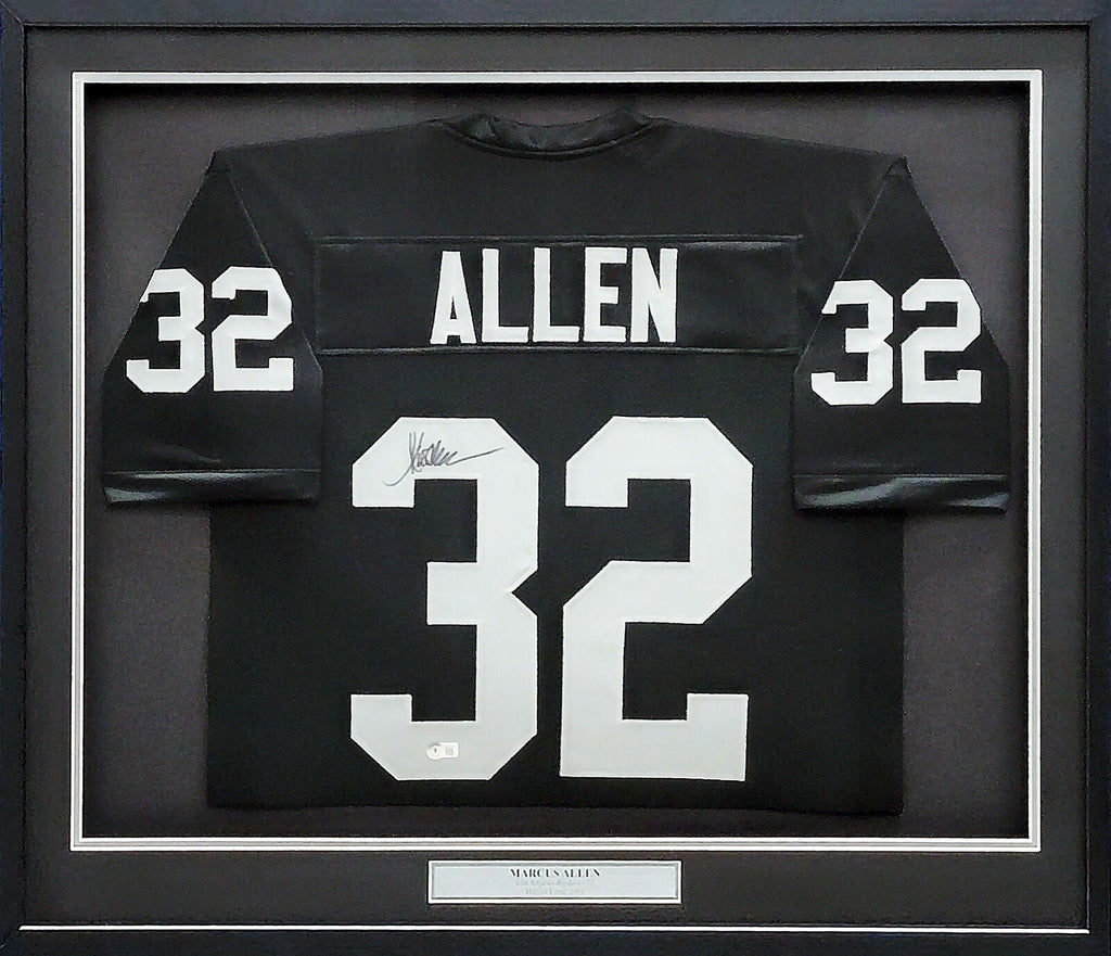 This is a framed Black Jersey, approximately 31x36 with the frame, that has been hand signed by Marcus Allen. This is a custom jersey with no name brand. The approximate size is XL. It has nice sewn in name and numbers. This item has been witnessed and certified authentic by Beckett Authentication (BAS) and comes with their tamper-proof witness sticker. Beckett Authentication has recently changed their physical certificate card policy where they no longer match their tamper-proof sticker with a physical certificate. A certificate can be printed on Beckett's website for the matching authentication number.