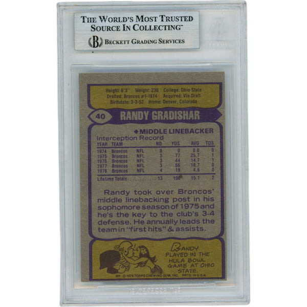 The number in the listing title is just an inventory sku for our records and is not the authentication number. The item pictured is a stock photo unless otherwise noted. This is a Denver Broncos 1979 Topps #40 Slabbed Trading Card that was personally autographed by Randy Gradishar. Includes a certificate of authenticity from Beckett Authentication Services (BAS) and Denver Autographs.FREE SHIPPING within the USA on orders over $10!