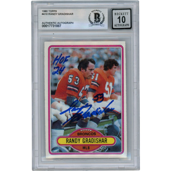 The number in the listing title is just an inventory sku for our records and is not the authentication number. The item pictured is a stock photo unless otherwise noted. This is a Denver Broncos 1980 Topps #410 Slabbed Trading Card with a grade 10 autograph that was personally autographed by Randy Gradishar. Includes a certificate of authenticity from Beckett Authentication Services (BAS) and Denver Autographs.FREE SHIPPING within the USA on orders over $10!