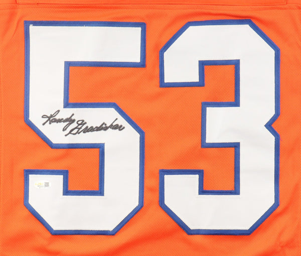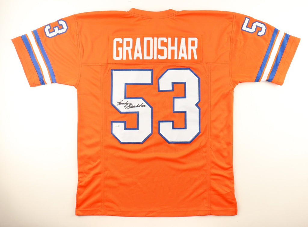 Custom on-field style jersey. Everything sewn on, size XL. Hand-signed by Randy Gradishar. The lot / autograph(s) includes an official James Spence Authentication (JSA) hologram and scannable QR Code card for authenticity purposes. The signing was witnessed by JSA.Authentication: JSA Scannable QR Code card