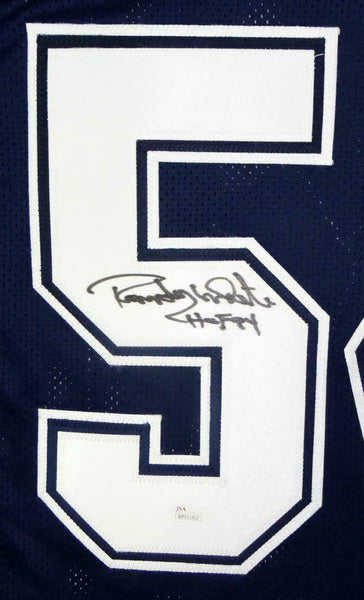 Randy White Autographed Blue Dbl Stitch Pro Style Jersey w/ HOF - JSA W Auth *5 THIS IS NOT AN NFL JERSEY - IT HAS NO TAGS, NO LOGOS, NO EMBLEMS. This is a Hand Autograph of Randy White and inscribed with HOF 94 on a custom made (non-name brand) authentic style jersey with stitched letters and numbers. This item has a James Spence Witness Authentication, which comes with a JSA #'ed sticker and a matching JSA Certificate of Authenticity. You can view this item on the SpenceLOA website, it shows when and where the item was signed. It was signed either at a public autograph appearance or a private signing. This is a stock photo of the item. Although you may not receive this exact item, the item you receive is virtually identical and brand new in great shape. Jersey size is XL.