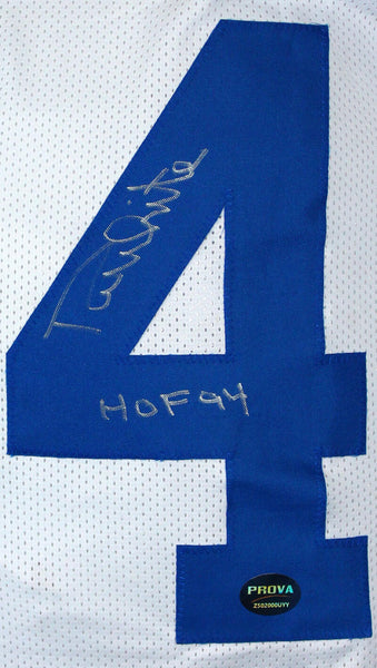 Randy White Autographed White Pro Style STAT Jersey w/HOF-Prova *Silver THIS IS NOT AN NFL JERSEY. THIS HAS NO TAGS, NO LOGOS, NO EMBLEMS. This is a Hand Autograph of Randy White on a custom made (Non Name Brand) authentic style STAT jersey with stitched letters and numbers. Inscribed HOF 94. This item has a Prova Authentication, which comes with a numbered Prova hologram and a generic Certificate of Authenticity. You can view this item on the Prova Authentication website. It was signed either at a public autograph appearance or a private signing. This is a stock photo of the item. Although you may not receive this exact item, the item you receive is virtually identical and brand new in great shape. Jersey size is XL.