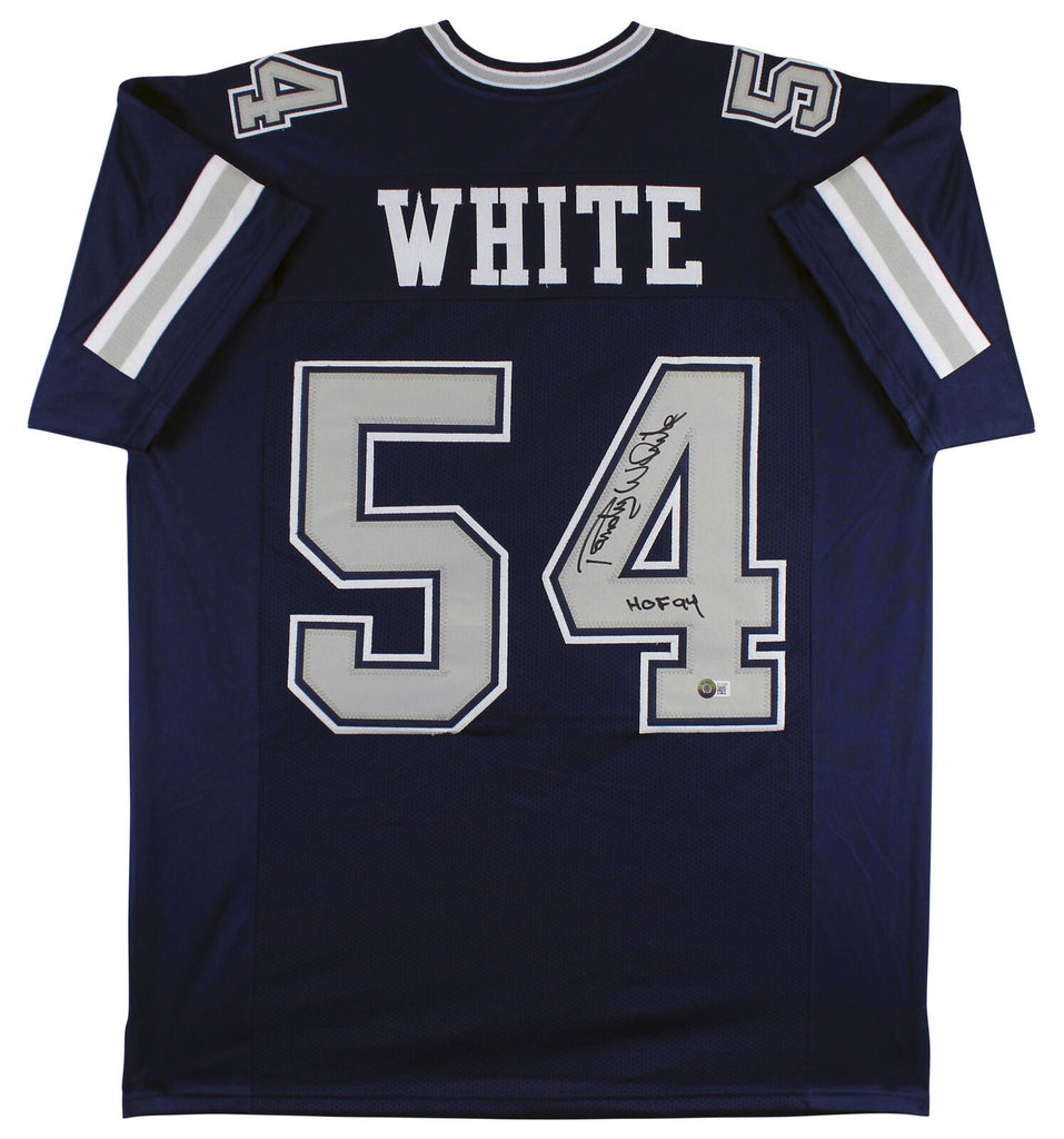 This Autographed w/ Grey Numbers Navy Blue Pro Style Jersey with the inscription of "HOF 94" has been Personally Signed by Randy White of the Dallas Cowboys. This item is 100% Authentic to include a hologram by Beckett Authentication Services. This item will come with the new Beckett Authentication hologram that has a scannable QR code rather than the traditional COA. If you would like to have a COA, you are welcome to reach out to Beckett for a printed certification once you receive your item. This is a BAS Witnessed Protection Program item which means a Beckett Authentication Service representative was present when this item was being signed. We conducted an autograph signing with Randy White where multiples of the same item were signed. While the photographs are representative of this item, the size, placement and strength of the signature may vary. Each item is hand signed, therefore, each autograph is unique. This item can be verified through BAS Witnessed. This is a X-Large sized, non-branded, custom-stitched Jersey.