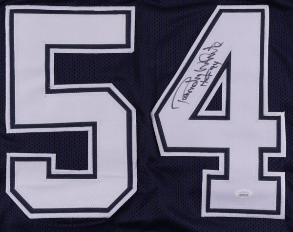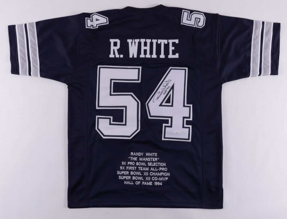 Custom on-field style jersey, everything sewn on. Jersey has been hand-signed by Randy White (HOF). White played professionally for the Dallas Cowboys from 1975 to 1988. He is a member of the College Football Hall of Fame, the Pro Football Hall of Fame and the Delaware Sports Museum and Hall of Fame.The lot / autograph(s) includes an official James Spence Authentication Services serially-numbered hologram and QR Code card for authenticity purposes. The signing of this item was witnessed by JSA.Authentication: James Spence QR Code card