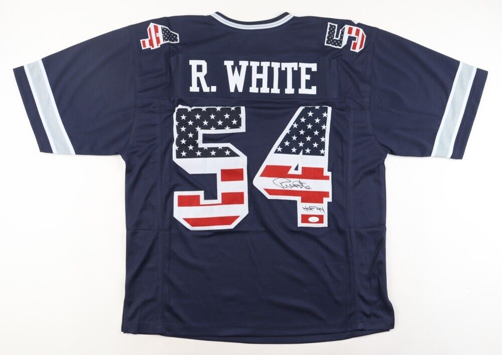 Custom on-field style jersey, everything sewn on. Jersey has been hand-signed in black paint pen by Randy White (HOF). White played professionally for the Dallas Cowboys from 1975 to 1988. He is a member of the College Football Hall of Fame, the Pro Football Hall of Fame and the Delaware Sports Museum and Hall of Fame.The autograph(s) includes an official James Spence Authentication (JSA) hologram and matching COA for authenticity purposes. The signing of this item was witnessed by JSA.Authentication: JSA COA
