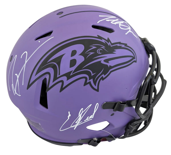This Autographed Alternate Rave Riddell Full Size Speed Proline Helmet W/ Uv Mirrored Back Acrylic Display Case has been Personally Signed by Ed Reed, Ray Lewis & Terrell Suggs of the Baltimore Ravens. This item is 100% Authentic to include a hologram by Beckett Authentication Services. This item will come with an affixed Beckett Authentication Services (BAS) authentication sticker, which includes a scannable QR code to verify authenticity. Please note that Beckett no longer provides serial-numbered COA cards, and the attached BAS sticker will serve as the complete authentication for this item. This is a BAS Witnessed Protection Program item which means a Beckett Authentication Service representative was present when this item was being signed. We conducted an autograph signing with Ed Reed, Ray Lewis & Terrell Suggs where multiples of the same item were signed. While the photographs are representative of this item, the size, placement and strength of the signature may vary. Each item is hand signed, therefore, each autograph is unique. This item can be verified through BAS Witnessed.