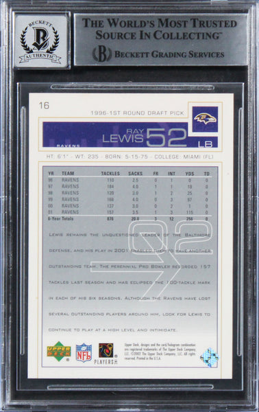 This Autographed Auto Graded Gem Mint 10! 2002 Upper Deck #16 Card has been Personally Signed by Ray Lewis of the Baltimore Ravens. This item is 100% Authentic, it comes slabbed and authenticated by Beckett Authentication Services. The authenticity can be verified on Beckett Authentication Services website.