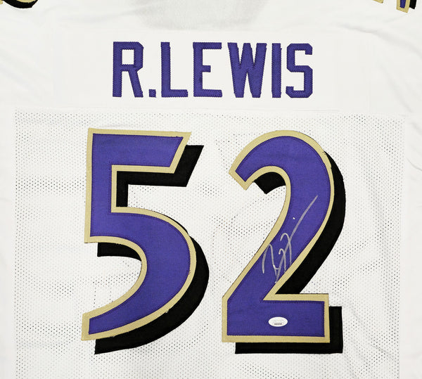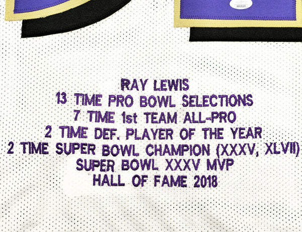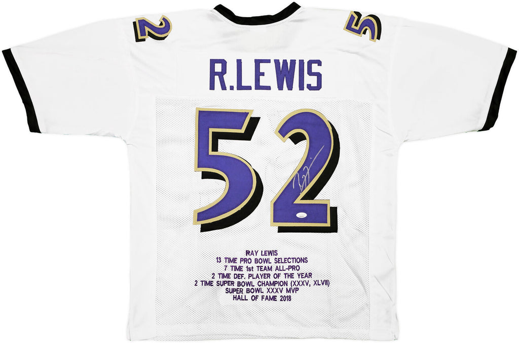 This is a White Football Jersey that has been hand signed by Ray Lewis. This is a custom jersey with no name brand. The approximate size is XL. It has nice sewn in name and numbers. This item has been certified authentic by JSA and comes with their tamper-proof sticker and matching certificate of authenticity.