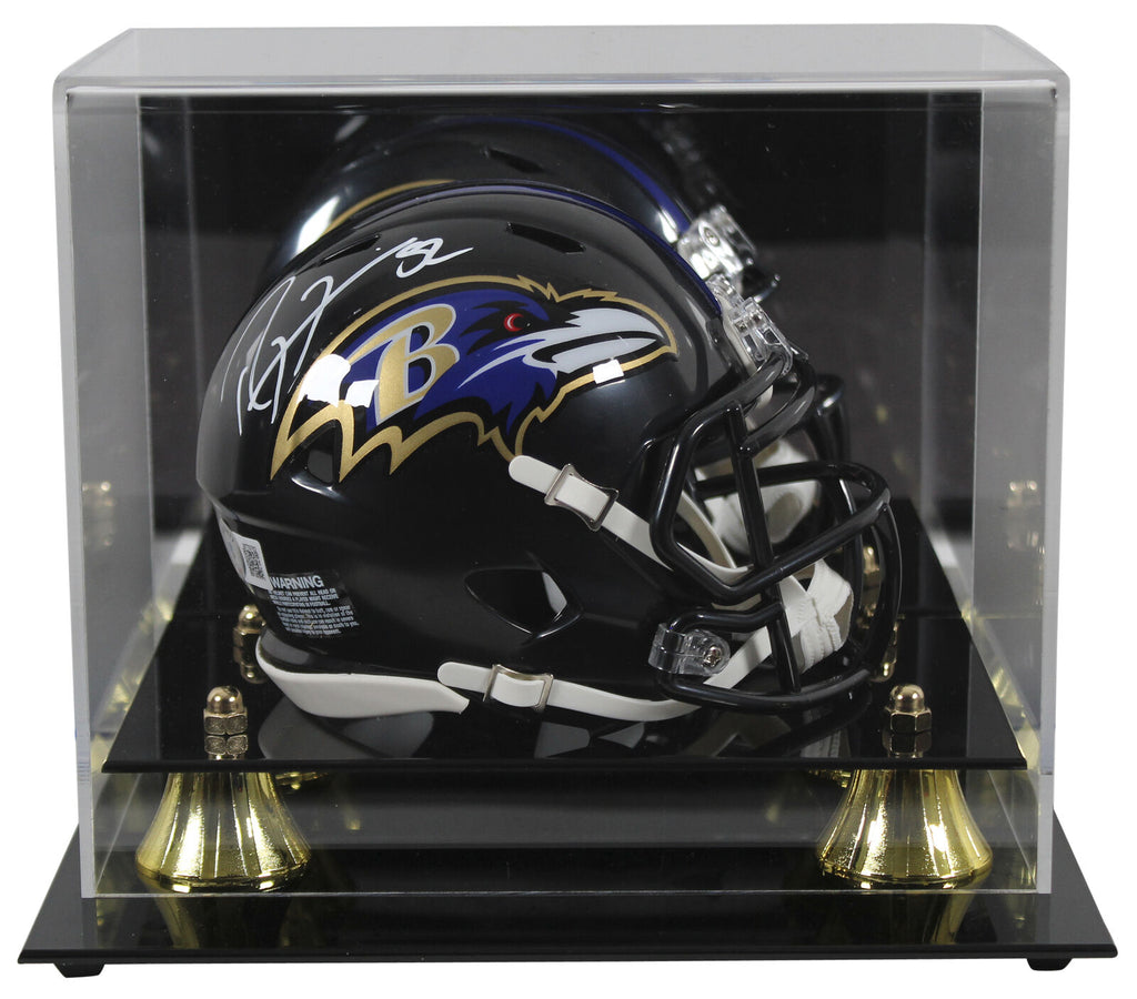 This Autographed w/ White Signature Speed Mini Helmet W/ Uv Mirrored Back Acrylic Display Case has been Personally Signed by Ray Lewis of the Baltimore Ravens. This item is 100% Authentic to include a hologram by Beckett Authentication Services. This item will come with the new Beckett Authentication hologram that has a scannable QR code rather than the traditional COA. If you would like to have a COA, you are welcome to reach out to Beckett for a printed certification once you receive your item. This is a BAS Witnessed Protection Program item which means a Beckett Authentication Service representative was present when this item was being signed. We conducted an autograph signing with Ray Lewis where multiples of the same item were signed. While the photographs are representative of this item, the size, placement and strength of the signature may vary. Each item is hand signed, therefore, each autograph is unique. This item can be verified through BAS Witnessed.