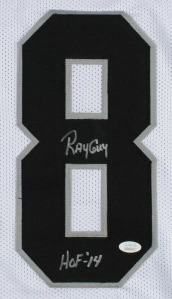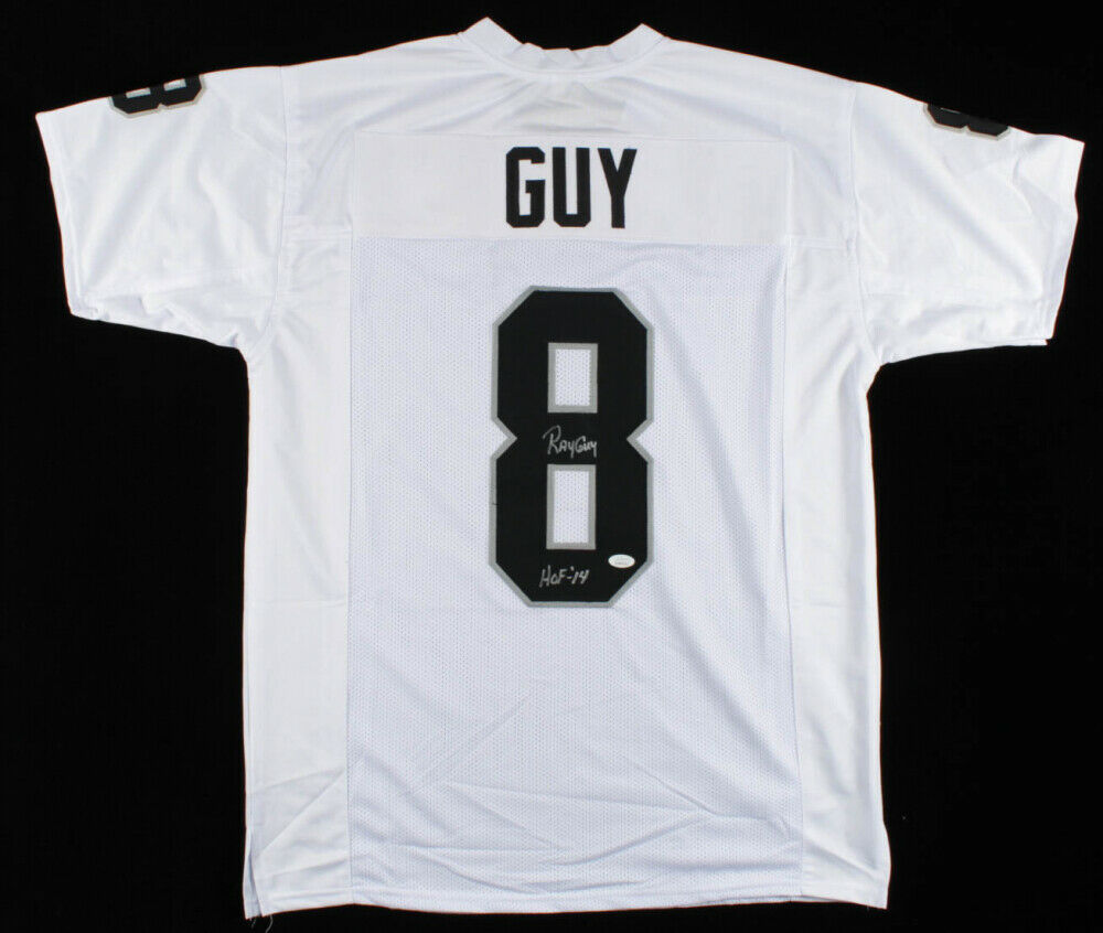 Custom on-field style jersey. Everything sewn on, size XL. Hand-signed in silver felt-tip pen by Ray Guy. The autograph includes an official James Spence Authentication (JSA) hologram for authenticity purposes. The signing of this item was witnessed by JSA.Authentication: JSA Hologram