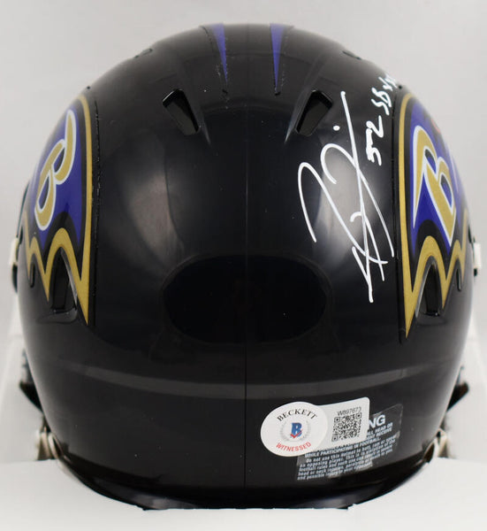 Ray Lewis Autographed Baltimore Ravens Speed Mini Helmet w/SB MVP-Beckett W Hologram *White This is a hand autograph of Ray Lewis of the Baltimore Ravens on a Riddell Football Speed Mini Helmet. Inscribed SB MVP. This item has a Beckett Witnessed Authentication, which comes with a numbered hologram and a QR Code for verification. You can view this item on the Beckett Authentication website, it shows when and where the item was signed. It was signed either at a public autograph appearance or a private signing. This is a stock photo of the item. Although you may not receive this exact item, the item you receive is virtually identical and brand new in great shape.