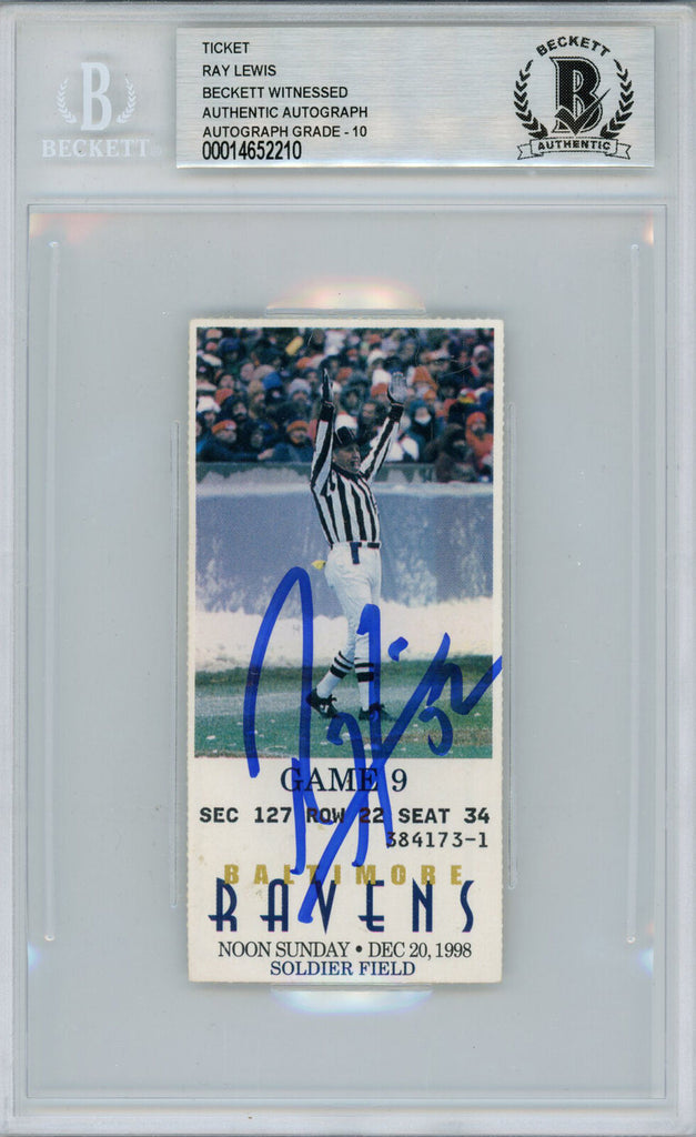 Ray Lewis Autographed/Signed 12/20/1998 vs Bears Ticket Beckett Slab 39188 The number in the listing title is just an inventory sku for our records and is not the authentication number. This is the exact item that you will receive so please see scans for condition. This is a official ticket that was personally autographed by Ray Lewis. This has been professionally slabbed by Beckett Authentication Services and includes a certificate of authenticity from Denver Autographs.