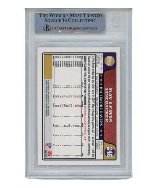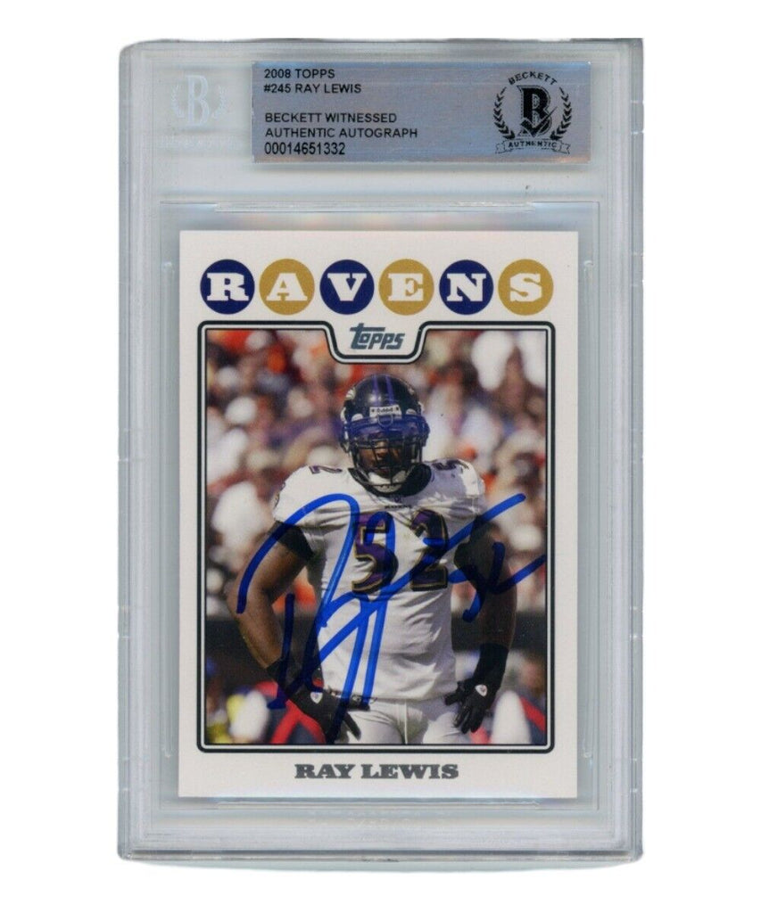 Ray Lewis Autographed/Signed 2008 Topps #245 Beckett 39438 The number in the listing title is just an inventory sku for our records and is not the authentication number. This is a 2008 Topps #245 that was personally autographed by Ray Lewis. This was professionally authenticated and slabbed by Beckett Authentication Services (BAS), also includes a certificate of authenticity from Denver Autographs.