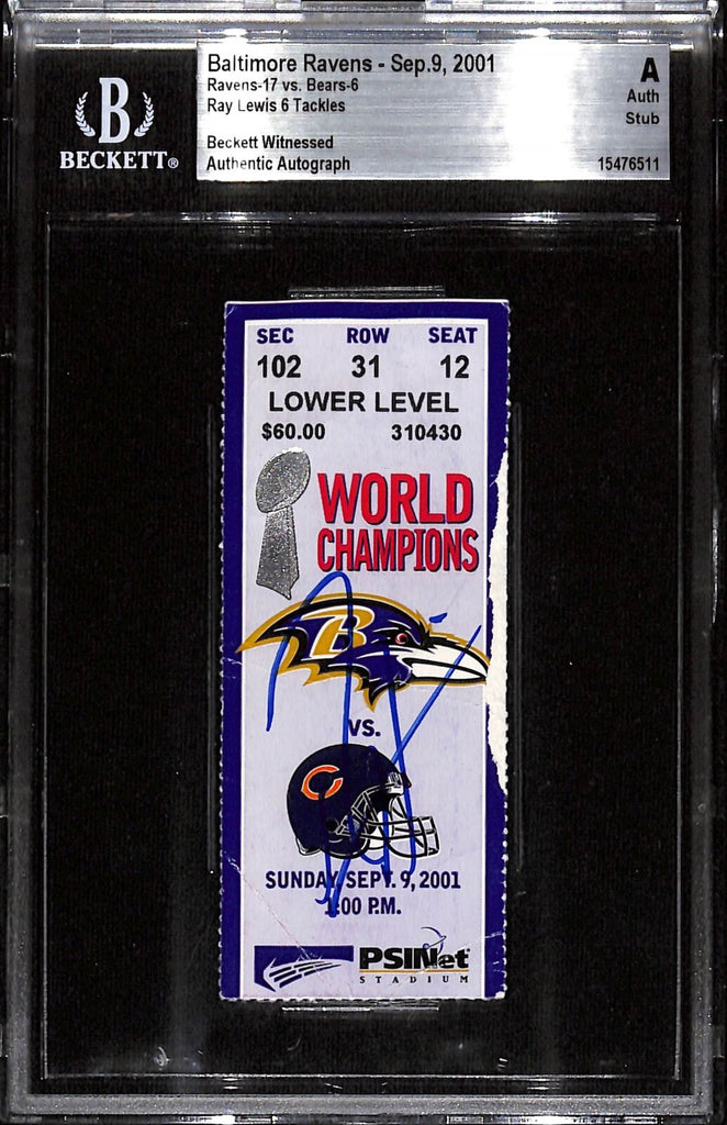 Ray Lewis Signed Baltimore Ravens 09/09/2001 Slab Ticket Beckett 37447 The number in the listing title is just an inventory sku for our records and is not the authentication number. The item pictured is a stock photo unless otherwise noted. This is a Baltimore Ravens Slabbed Ticket Stub dated 09/09/2001 that was personally autographed by Ray Lewis. Includes a certificate of authenticity from Beckett Authentication Services (BAS) and Denver Autographs.
