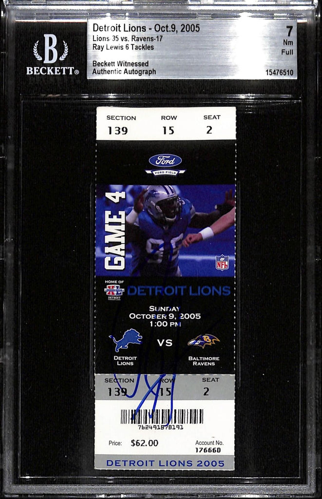 Ray Lewis Signed Baltimore Ravens 10/9/05 Slab Ticket 7 Grade Beckett 37449 The number in the listing title is just an inventory sku for our records and is not the authentication number. The item pictured is a stock photo unless otherwise noted. This is a Baltimore Ravens Slabbed Ticket Stub Grade 7 dated 10/09/2005 that was personally autographed by Ray Lewis. Includes a certificate of authenticity from Beckett Authentication Services (BAS) and Denver Autographs.