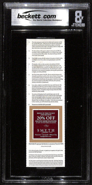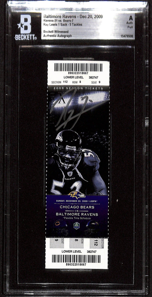 Ray Lewis Signed Baltimore Ravens 12/20/2009 Slab Ticket Beckett 37445 The number in the listing title is just an inventory sku for our records and is not the authentication number. The item pictured is a stock photo unless otherwise noted. This is a Baltimore Ravens Slabbed Ticket Stub dated 12/20/2009 that was personally autographed by Ray Lewis. Includes a certificate of authenticity from Beckett Authentication Services (BAS) and Denver Autographs.