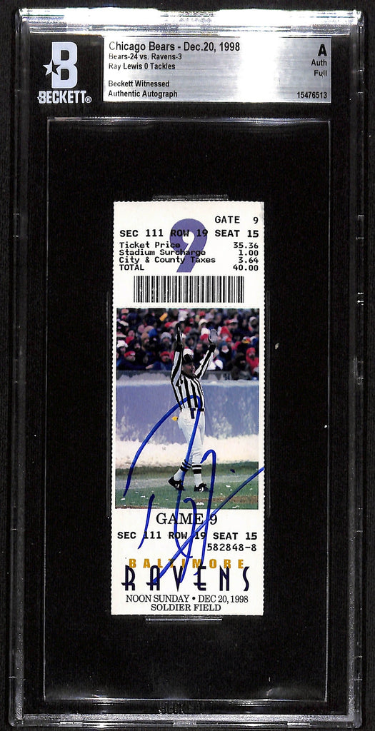 Ray Lewis Signed Baltimore Ravens 12/20/98 Slab Ticket 7 Grade Beckett 37446 The number in the listing title is just an inventory sku for our records and is not the authentication number. The item pictured is a stock photo unless otherwise noted. This is a Baltimore Ravens Slabbed Ticket Stub Grade 7 dated 12/20/1998 that was personally autographed by Ray Lewis. Includes a certificate of authenticity from Beckett Authentication Services (BAS) and Denver Autographs.