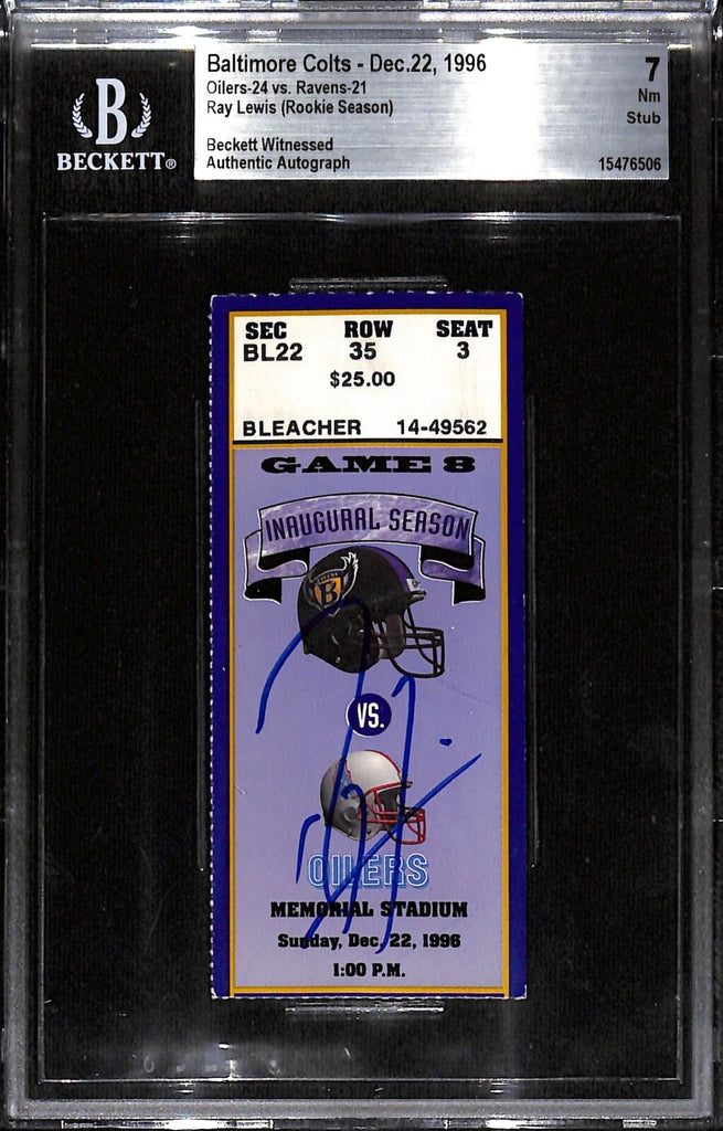 Ray Lewis Signed Baltimore Ravens 12/22/96 Slab Ticket 7 Grade Beckett 37442 The number in the listing title is just an inventory sku for our records and is not the authentication number. The item pictured is a stock photo unless otherwise noted. This is a Baltimore Ravens Slabbed Ticket Stub Grade 7 dated 12/22/1996 that was personally autographed by Ray Lewis. Includes a certificate of authenticity from Beckett Authentication Services (BAS) and Denver Autographs.