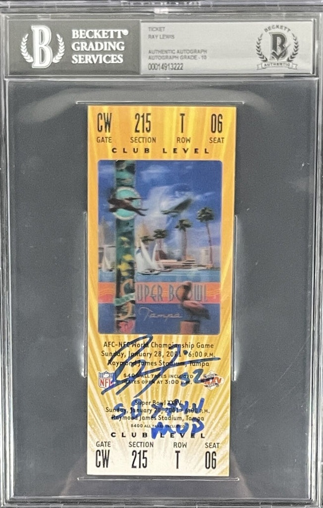 Ray Lewis Signed Baltimore Ravens SB XXXV SB MVP Ticket Stub Slab Beckett 36419 The number in the listing title is just an inventory sku for our records and is not the authentication number. This is the exact item that you will receive so please see pictures for condition. This is a Super Bowl XXXV ticket stub that was personally autographed by Ray Lewis with inscription "SB MVP". This has been professionally slabbed by Beckett Authentication Services (BAS) and includes a certificate of authenticity from Denver Autographs.