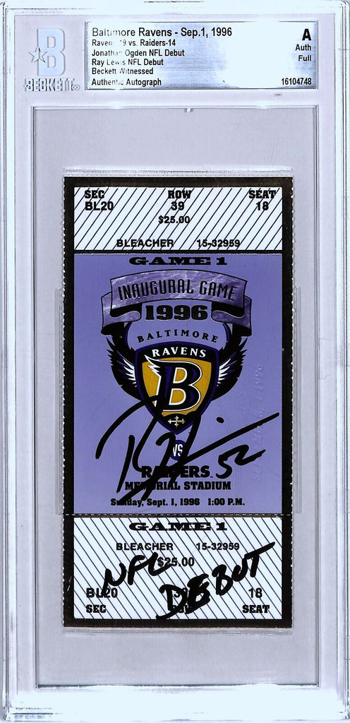 Ray Lewis Signed Baltimore Ravens Ticket Stub 09/01/96 Debut Beckett Slab 43233 The number in the listing title is just an inventory sku for our records and is not the authentication number. The item pictured is a the exact item you will receive, please see photos for condition. This is a Baltimore Ravens Slabbed Ticket Stub 09/01/96 that was personally autographed by Ray Lewis with "NFL Debut" inscription. Includes a certificate of authenticity from Beckett Authentication Services (BAS) and Denver Autographs.