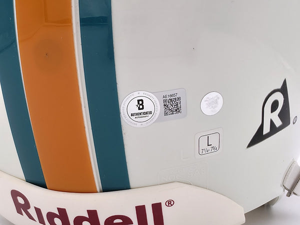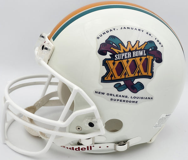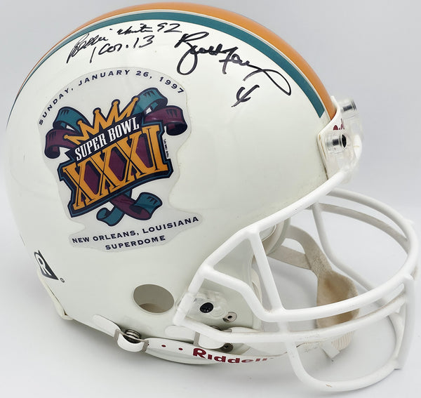 This is a Green Bay Packers White Full Size Authentic Super Bowl XXXI Logo Helmet that has been hand signed by Reggie White & Brett Favre. This item has been certified authentic by Beckett Authentication (BAS) and comes with their tamper-proof hologram and matching full-page certificate of authenticity.