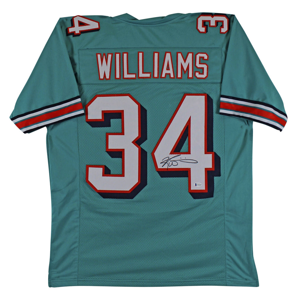 This Autographed Teal Pro Style Jersey has been Personally Signed by Ricky Williams of the Miami Dolphins. This item is 100% Authentic to include a hologram by Beckett Authentication Services. This item will come with the new Beckett Authentication hologram that has a scannable QR code rather than the traditional COA. If you would like to have a COA, you are welcome to reach out to Beckett for a printed certification once you receive your item. This is a BAS Witnessed Protection Program item which means a Beckett Authentication Service representative was present when this item was being signed. This is a stock item. We conducted an autograph signing with Ricky Williams and we have several of these available. The one you will receive will be of equal quality to the one pictured. This item can be verified through BAS Witnessed. This is a X-Large sized, non-branded, custom-stitched Jersey.