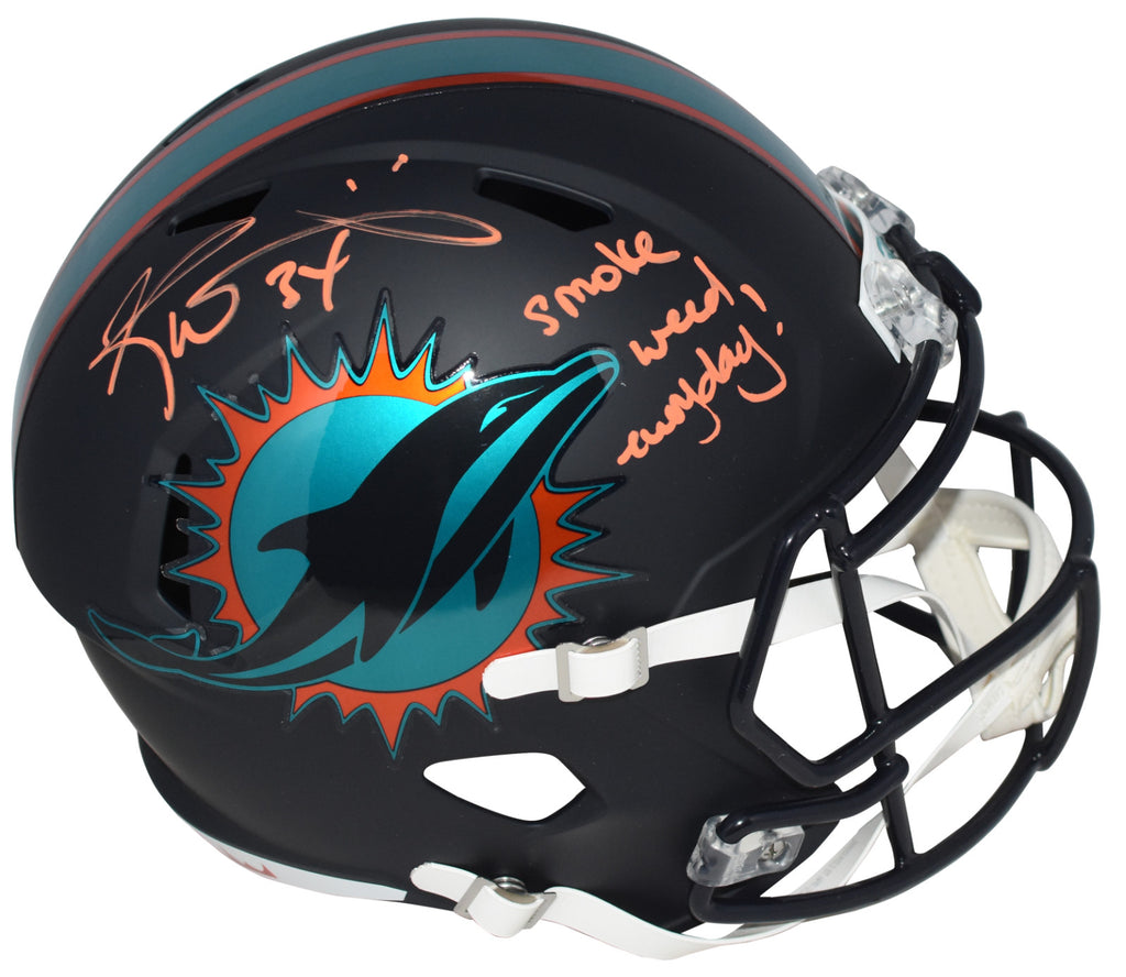 Ricky Williams, former Pro Bowl running back for the Miami Dolphins, has hand signed this Dolphins Riddell Speed 2025 Rivalries full-size replica helmet at a private signing. He included the inscription "Smoke Weed Everyday". This item is authenticated by Beckett Authentication Services and was signed in the presence of one of their representatives. Their tamper-evident hologram featuring a QR code and serial number is on the item. The authenticity can be verified online by entering the serial number or scanning the QR code.Item pictured may not be the exact item you will receive. It will be similar quality, and we guarantee your satisfaction.