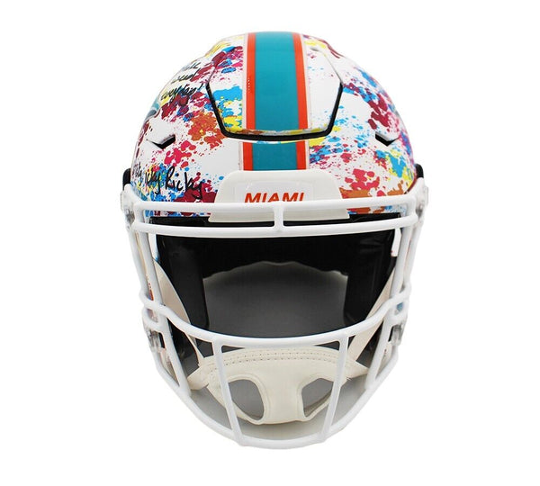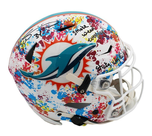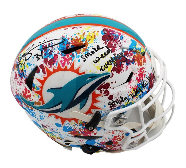 A Miami Dolphins Speed Flex Authentic Custom Splatter NFL Helmet hand signed by Ricky Williams. The item and signature are in excellent condition. In addition to signing his name, Ricky inscribed "Smoke Weed Everyday! & Sticky Icky Ricky!" on the item. Ricky Williams is a former NFL running back, he won the 1998 Heisman Trophy, Maxwell Award, Walter Camp Award, he is a Pro Bowler, and First-team All-Pro. AUTHENTICATION: The item is accompanied by a Certificate of Authenticity - Serial Numbered and Databased Hologram - Picture of Ricky from the Signing -