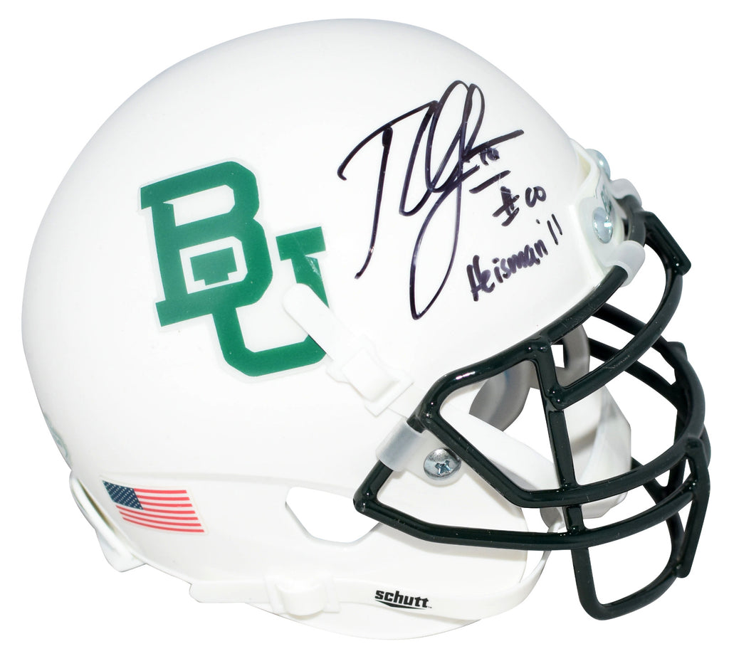 Robert Griffin III, former Heisman Trophy winning quarterback for the Bears, has hand signed this Baylor Schutt mini helmet at a private signing. He included the inscription "Heisman 11" with his signature. This item comes with a certificate of authenticity (COA) from Beckett Authentication Services and was signed in the presence of one of their representatives. You will receive a serial-numbered COA along with a matching serial-numbered sticker on the helmet. The authenticity can be verified online by entering the serial number.Item pictured may not be the exact item you will receive. It will be similar quality, and we guarantee your satisfaction.