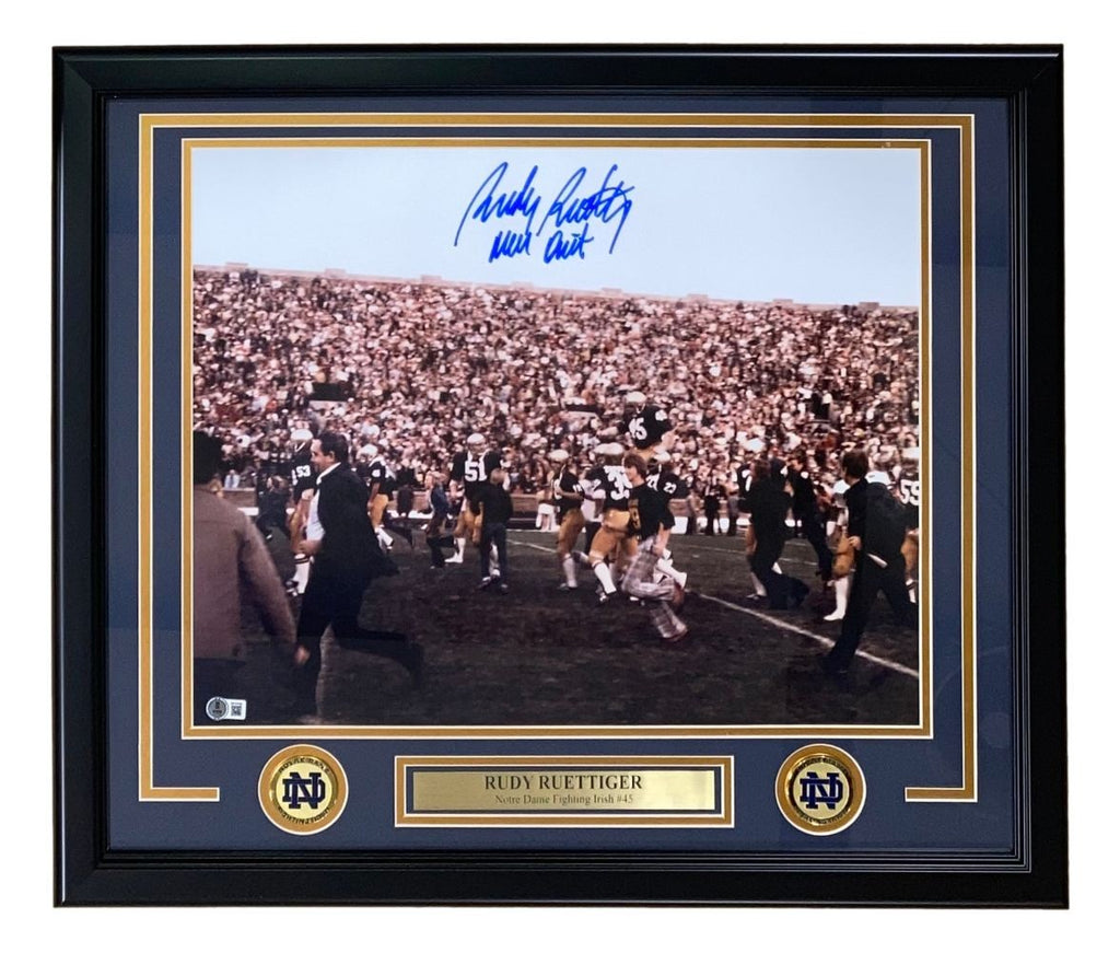Featured is a Rudy Ruettiger signed 16x20 Notre Dame photo, inscribed "Never Quit". This photo has been hand signed by Ruettiger and comes with the Beckett hologram and certificate of authenticity. This photo has been professionally framed and matted and is approximately 22x27. This photo would make a great addition to any sports memorabilia collection!. SPECIFICATIONS Autographed By: Rudy Ruettiger Team: Notre Dame Sport: Football Authentication: Beckett Grading Services