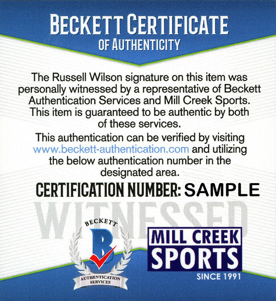 This is a Wisconsin Badgers Full Size Eclipse Black Speed Replica Helmet that has been hand signed by Russell Wilson. This item has the official tamper-proof Russell Wilson serial numbered hologram and matching certificate of authenticity. A It has also been authenticated with the Beckett Witness certification, meaning both a representative from Beckett and Mill Creek Sports witnessed the signing. A It also comes with their sticker and matching certificate of authenticity. A NOTE: The Eclipse Black helmets are very delicate and often have some marks or scratches on them.