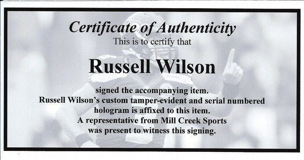 This is a Seattle Seahawks Mini Helmet that has been hand signed by Russell Wilson. This one is signed in silver. This item has the official tamper-proof Russell Wilson serial numbered hologram and matching certificate of authenticity.